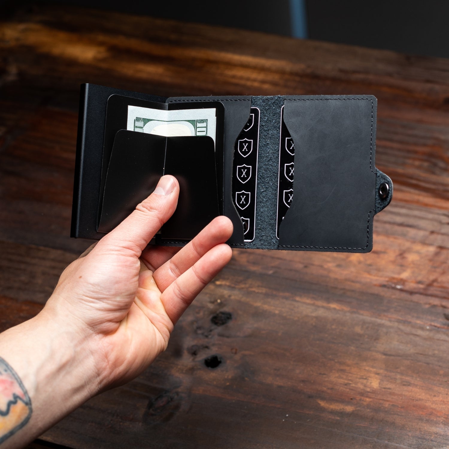 - Tarjetero con deslizador incorporado con capacidad para 4-6 tarjetas, además, cuenta con bolsillos interiores para 4-6 tarjetas adicionales llegando a un total de 8-12 tarjetas por billetera. Incluye espacio para guardar múltiples billetes.