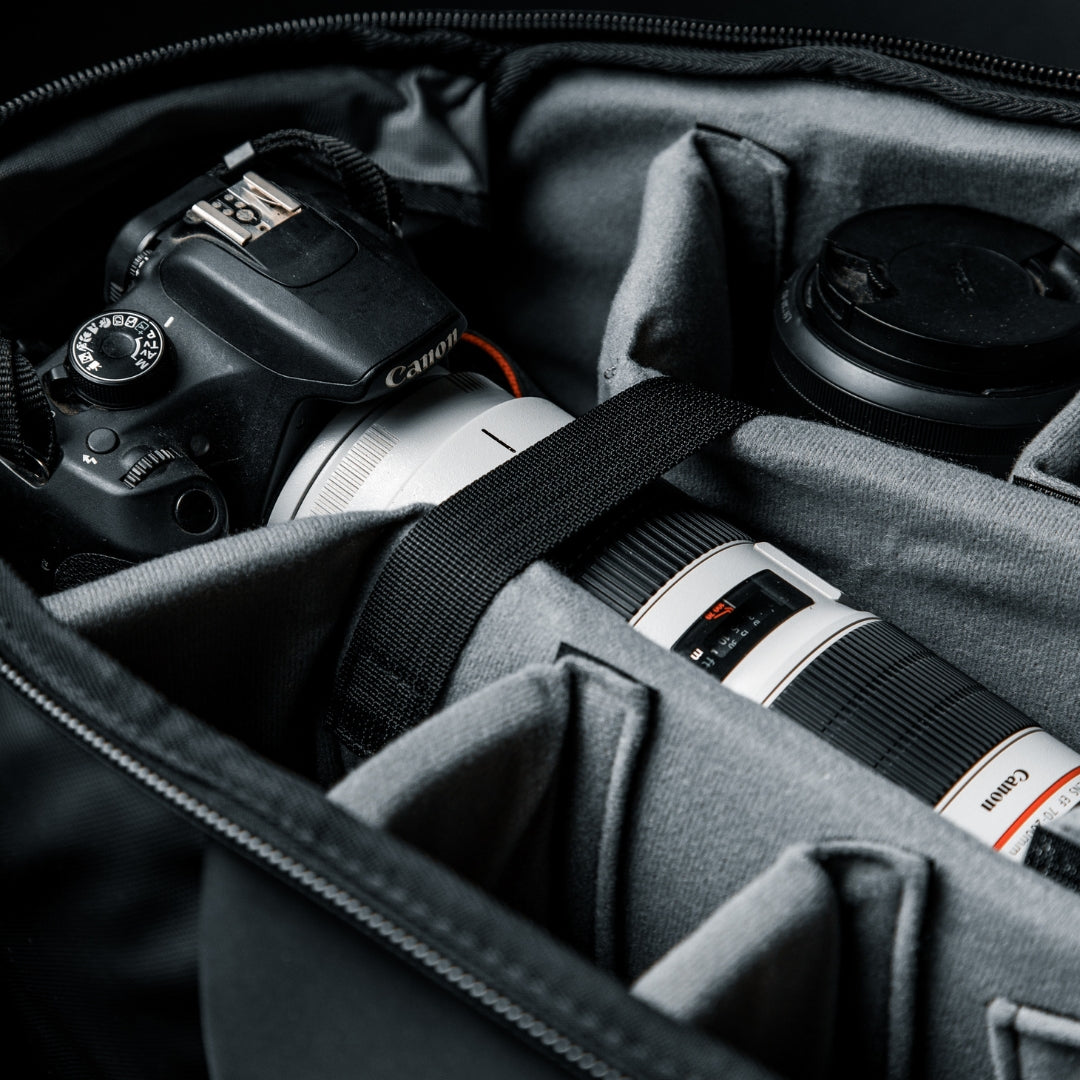 Nuestra Photography Backpack cuenta con separadores personalizables y removibles que permiten cuidar tu cámara y accesorios, además de tranformar tu mochila para cámara en una de viaje o uso diario.